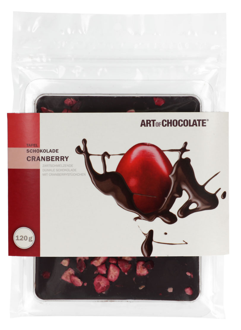 Feine Edelbitterschokolade mit mindestens 70% Kakaoanteil und fruchtige Cranberrys.