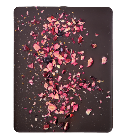 Zutaten: Kakaomasse, Zucker, Kakaobutter, 1% Cranberry gefriergetrocknet, Vanilleextrakt, Emulgator (SOJALECITHIN).
