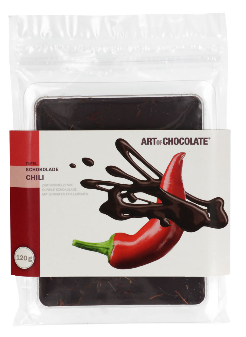 Zartschmelzende Edelbitterschokolade (mindestens 70% Kakao) mit scharfen Chili-Aromen.