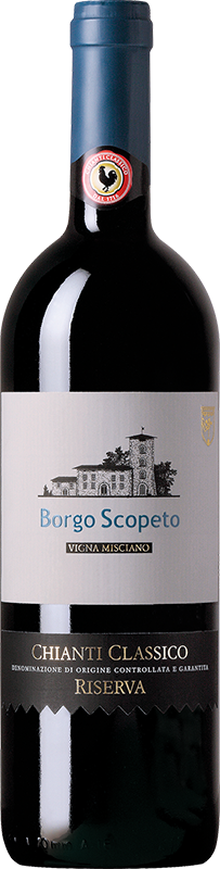 Der Wein stammt aus Misciano, einem kleinen Ort, der im 15. Jahrhundert verlassen wurde und heute Namensgeber für den wichtigsten Weinberg von Borgo Scopeto ist. Gelegen auf 360 Metern über dem Meeresspiegel, in einer Süd-/Südostlage mit einem Boden aus sandigem Lehm, wird dieser Wein nur in herausragenden Jahrgängen produziert, nach einer sorgfältigen Auswahl der Trauben. Das Etikett, das alle Weine von Borgo Scopeto ziert, symbolisiert den historischen Wohnkern des Anwesens, das einst der berühmten sienesischen Dynastie Sozzini gehörte. Das Herrenhaus und die Bauernhäuser entstanden rund um den rechteckigen Turm, der im Laufe der Jahrhunderte mehrfach renoviert wurde. Heute, nach einer behutsamen Restaurierung, ist Borgo Scopeto ein exklusives Relais im Herzen des Chianti Classico, das seinen Gästen ein unvergleichliches Erlebnis bietet.